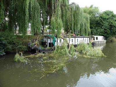 This boat, with a willow tree fallen on it was moored on the Visitor Moorings at Sawbridgeworth. It doesn't seem that the boat is damaged at all, but it must have been quite a shock when it fell.