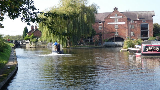 Soon after we set off on Sunday (20th September) we came under this turnover bridge. There is no towpath under the bridge because it changes sides of the canal here. There is a saying about passing elephants or camels through the eye of a needle and here we are having a go with a narrow boat through a narrrow bridge - just inches to spare on either side. No broadbeam boats here, though beyond Burton upon Trent (specifically beyond Dallow Lock which is the last narrow one) the canal becomes wide enough to take 14 foot wide boats.This is us approaching Tatenhill Lock, one of our favourites. The lock is fairly remote with just the attractive lock house (now a B&B) beside it. Only 3 feet 7 inches fall, so an easy and quick lock to navigate with another of the very narrow bridges below it.